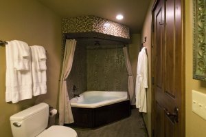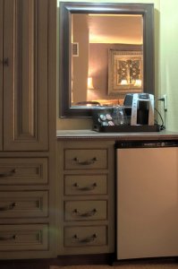 Emerald Suite’s warm interior is designed to make you feel at home, with a king-size bed, a queen-sized sleeper sofa, and a corner table set up for taking breakfast or dinner in the privacy of your Suite. A coffee bar is provided with a Keurig coffee-maker and an under counter refrigerator. The bathroom’s luxurious interior is complemented by beautiful custom glass tile work, with warm emerald hues that contribute to the marvelous atmosphere. In this premier suite, you will enjoy luxurious surroundings and comfort with all of the conveniences you need to make your stay enjoyable.