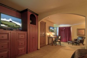 The Ruby Suite is also called the honeymoon suite, with romance woven into the very essence of the room. Walk past the living room area, past the desk area and queen-size sofa sleeper to fall in love with the lush bedroom area. The lovely hues of ruby red and chocolate bedding are sure to delight you, with golden lamplight filling your secluded alcove with warmth. This suite’s bath is custom-made, the floor paved with pebble tiling that leads to a large, oval air tub separate from the toilet area. Bathrobes are provided for your use as you please.